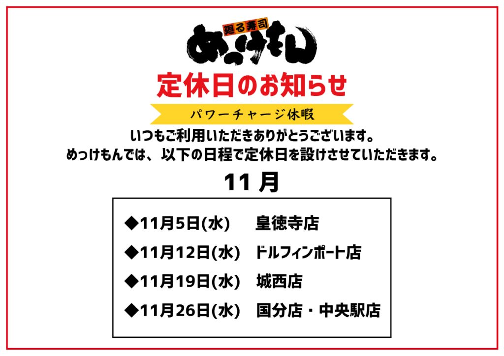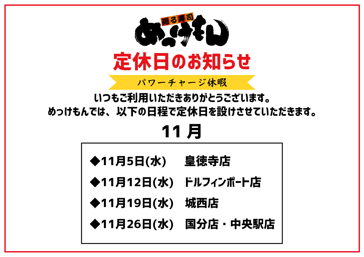 いつもご利用いただきありがとうございます。めっけもんでは、以下の日程で定休日を設けさせていただきます。