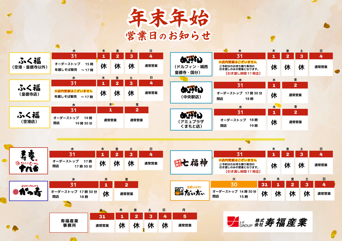 ご利用いただきありがとうございます。七福神では、以下の日程で定休日を設けさせていただきます。
