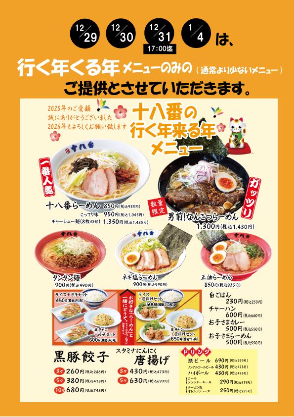 【十八番】12/29~1/4 年末年始メニューのお知らせ