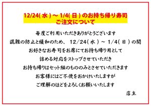 【めっけもん】2025/12/24(水)~2026/1/4(日)のお持ち帰り寿司 ご注文について