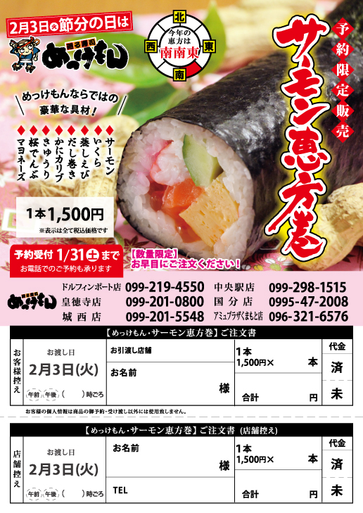 めっけもんでは、予約限定販売サーモン恵方巻をご案内しています。