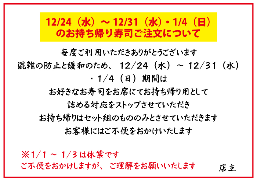 ※12/31大晦日のお持ち帰り寿司は完売いたしました。ありがとうございました。【2025/12/24記】