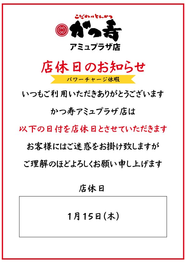 かつ寿アミュプラザ店では、以下の日程で定休日を設けさせていただきます。