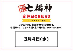 2026年2月1日 / 最終更新日 : 2026年1月30日 jfgroupUser お店からのお知らせ 【めっけもん】3月 定休日のお知らせ いつもご利用いただきありがとうございます。 めっけもんでは、以下の日程で定休日を設けさせていただきます。 ご迷惑をお掛けしますが、よろしくお願い致します。 FacebooktwitterCopy