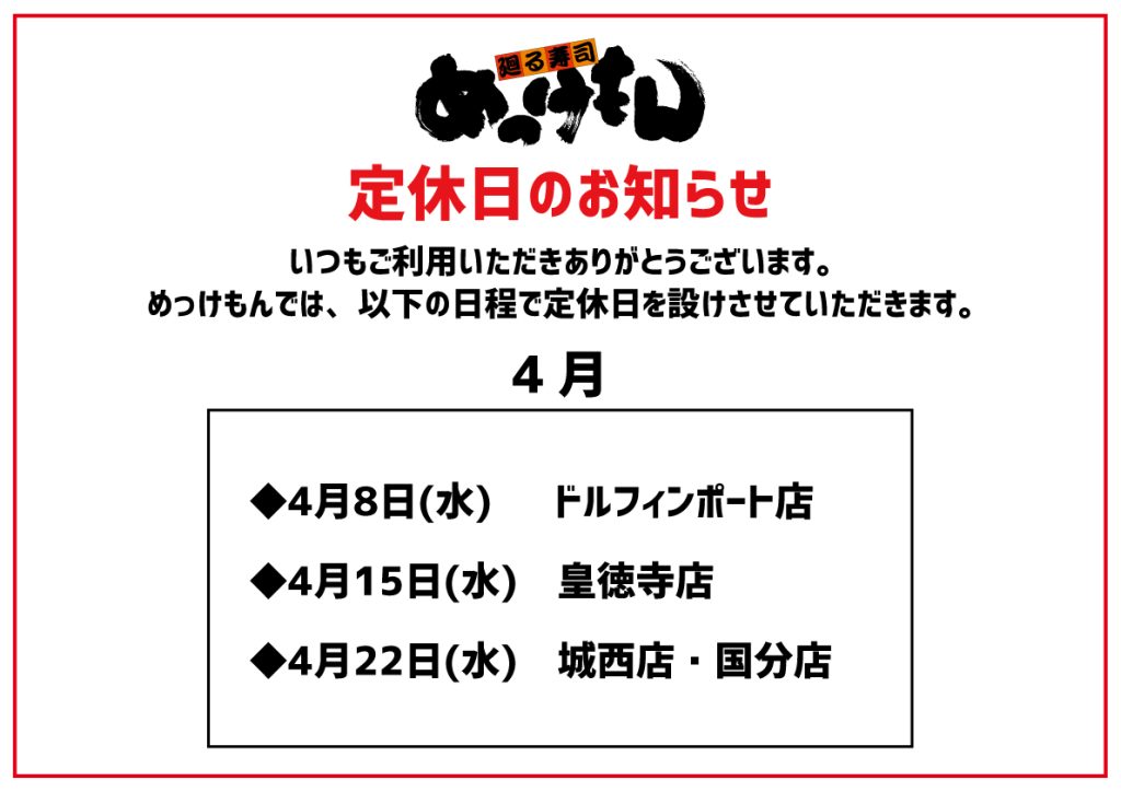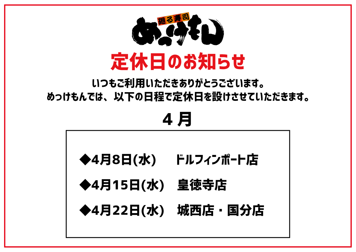 2026年3月4日 / 最終更新日 : 2026年3月4日 jfgroupUser お店からのお知らせ 【めっけもん】4月 定休日のお知らせ いつもご利用いただきありがとうございます。 めっけもんでは、以下の日程で定休日を設けさせていただきます。 ご迷惑をお掛けしますが、よろしくお願い致します。 FacebooktwitterCopy
